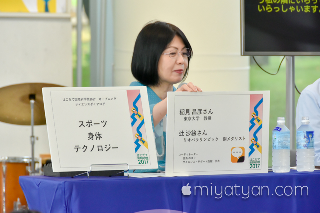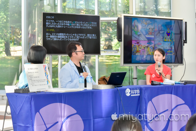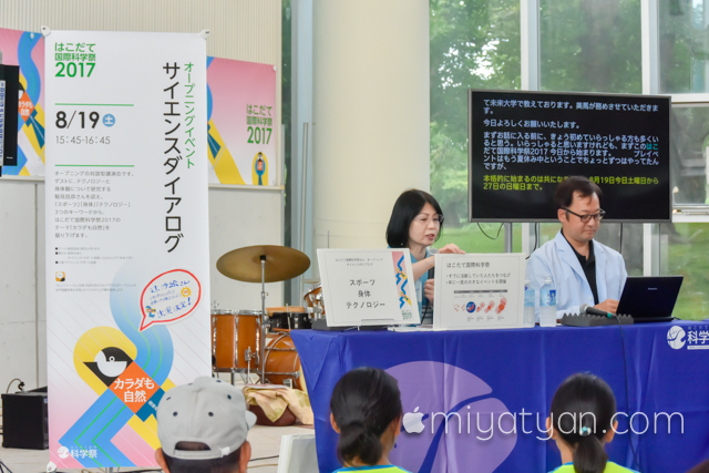 オープニングの対談型講演会。テクノロジーと身体観について研究する稲見昌彦さんを迎え「スポーツ」「身体」「テクノロジー」の3つのキーワードから、科学祭2017のテーマを掘り下げます